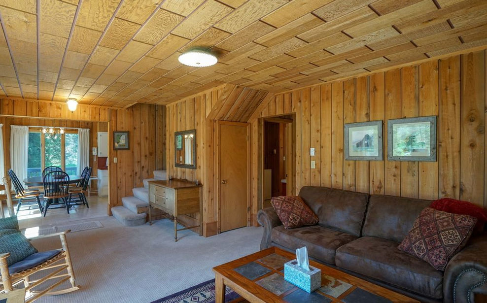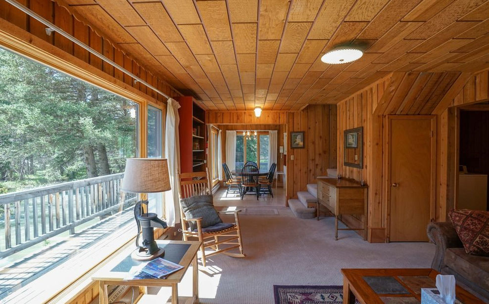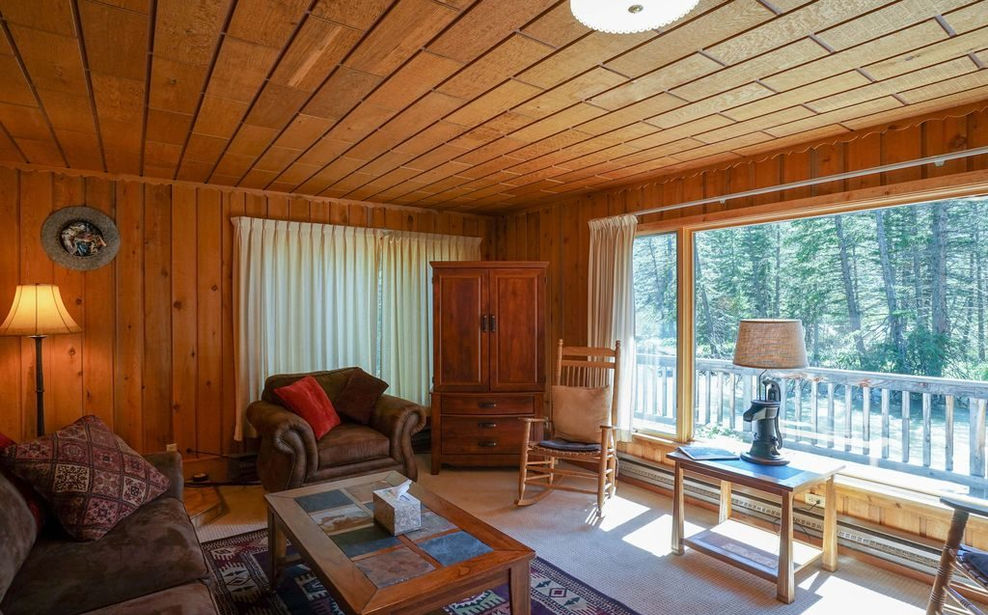 The Madison River Fishing Cabin is a charming private get-a-way located on a braid of the Madison River, near the big bend of the river. The spectacular deck runs the length of the cabin and is perched on the edge of the river itself. Here you'll enjoy relaxing in one of the many cozy deck chairs while listening to the babbling sounds of the river. The cabin has 3 bedrooms, 2 bathrooms, a galley kitchen, and a small dining area that overlooks the river and deck. The master bedroom with a king-size bed on the main floor is adjacent to a full bath. There are two bedrooms upstairs, each with two twin beds, and a shared bathroom. The cabin is located a few miles below the Three Dollar Bridge.